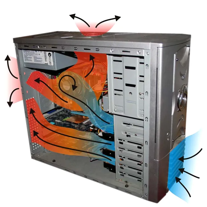 Fluxul de aer – este elementul definitoriu pentru o carcasa. Cu cat acesta este mai bun cu atat componentele PC-ului vor avea o durata de viata mai lunga si vor functiona in parametrii normali oferind o performanta cat mai buna. Aproape orice carcasa fie ea mica, medie sau mare are acelasi flux de aer. Acesta trebuie sa intre in carcasa prin partea frontala racind placa sau placile grafice, circuland in acelasi timp si prin radiatorul procesorului si iesind din carcasa prin partea superioara. Motivul este simplu. Aerul rece se afla aproape de sol pe cand aerul cald se ridica deasupra acestuia.