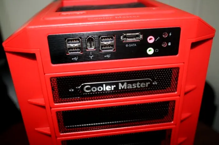 Unul dintre cele mai notabile aspecte ale acestui sistem este cat se poate de evident, si anume carcasa Cooler Master HAF 932 AMD Edition, un full-tower care face toti banii (si nu putini, intrucat daca vreti o astfel de carcasa o puteti achizitiona si separat la 7oo de lei), oferind un spatiu interior mai mult decat generos si o racire optima pentru componente. Racirea este asigurata de doua imense ventilatoare cu diametrul de 230 mm, pozitionate in fata si deasupra, precum si de un al treilea ventilator de 140 mm amplasat in spate. Acestea contribuie considerabil la zgomotul de fond de care vorbeam mai devreme, dar daca vrei sa le schimbi cu unele silentioase de 120 mm se poate. Panoul fontal al versiunii AMD a carcasei este colorat intr-un rosu aprins ceea ce suprinde la inceput, ca deschizi o cutie care ar trebui sa contina Vision Black, dar in cele din urma vei fi placut surpsins, pentru ca rosuyl il prinde foarte bine. Designul masiv si oarecum militarizat ii confera sistemului un aspect general de forta, confirmat, de altfel, de configuratia aleasa.