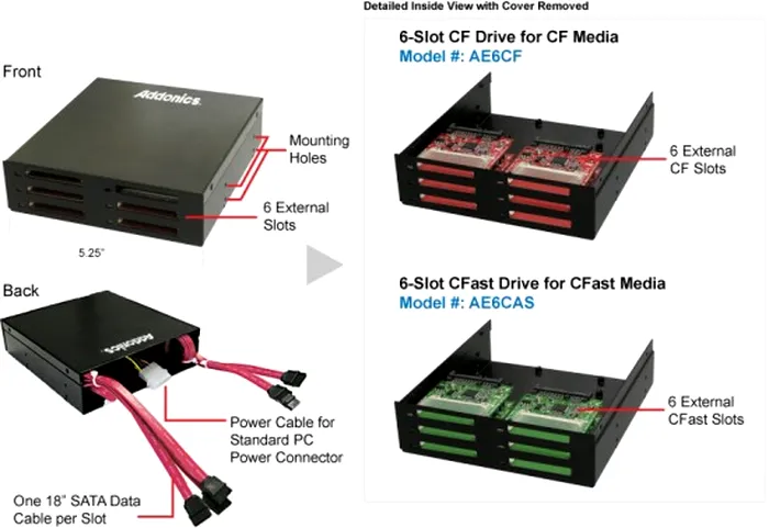 CFast Drive este un nou concept de hard disk de 5,25 inci, care inauntru poate gazdui pana la 6 carduri CF, fiecare cu interfetele de transfer proprii si cu alimentari separate. Astfel, puteti avea: fie 6 noi partitii in My Computer, fie una singura care sa releve o configuratie de RAID obtinuta din CF-uri. Chiar daca poza poate spune cu succes 1.000 de cuvinte, din posibilitatile noului CFast Drive e important sa percepi faptul ca acest nou produs poate fi o cale de upgrade catre SSD-uri, mai degraba decat un soi de hard disk extern.