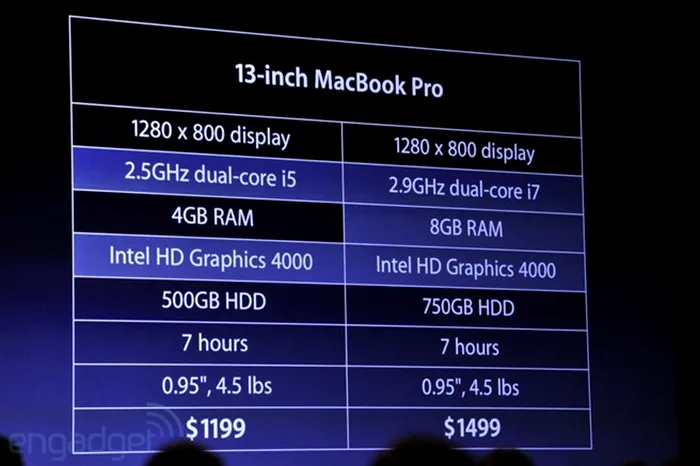 Tot acum s-a lansat un nou sistem portabil care poarta numele extrem de sugestiv de Next Generation MacBook Pro. Cu o grosime de 0,71 inci, aproape la fel de subtire ca MacBook Air, cu doar 2 kilograme greutate. Ecranul este de 15,4 inci, iar panoul folosit este Retina Display cu o rezolutie incredibila de 2880 x 1800 – 220 ppi. Unghiuri de vizibilitate sunt extrem de bune iar glare-ul a fost redus cu 75%. Sistemul de operare a fost actualizat pentru noul ecran. Autonomia noului MacBook este de pana la 7 ore. In ceea ce priveste conectica, noul MacBook cu ecran Retina are doua porturi Thunderbolt, doua USB-uri, un HDMI, un cititor de SD-uri si o mufa de casti.