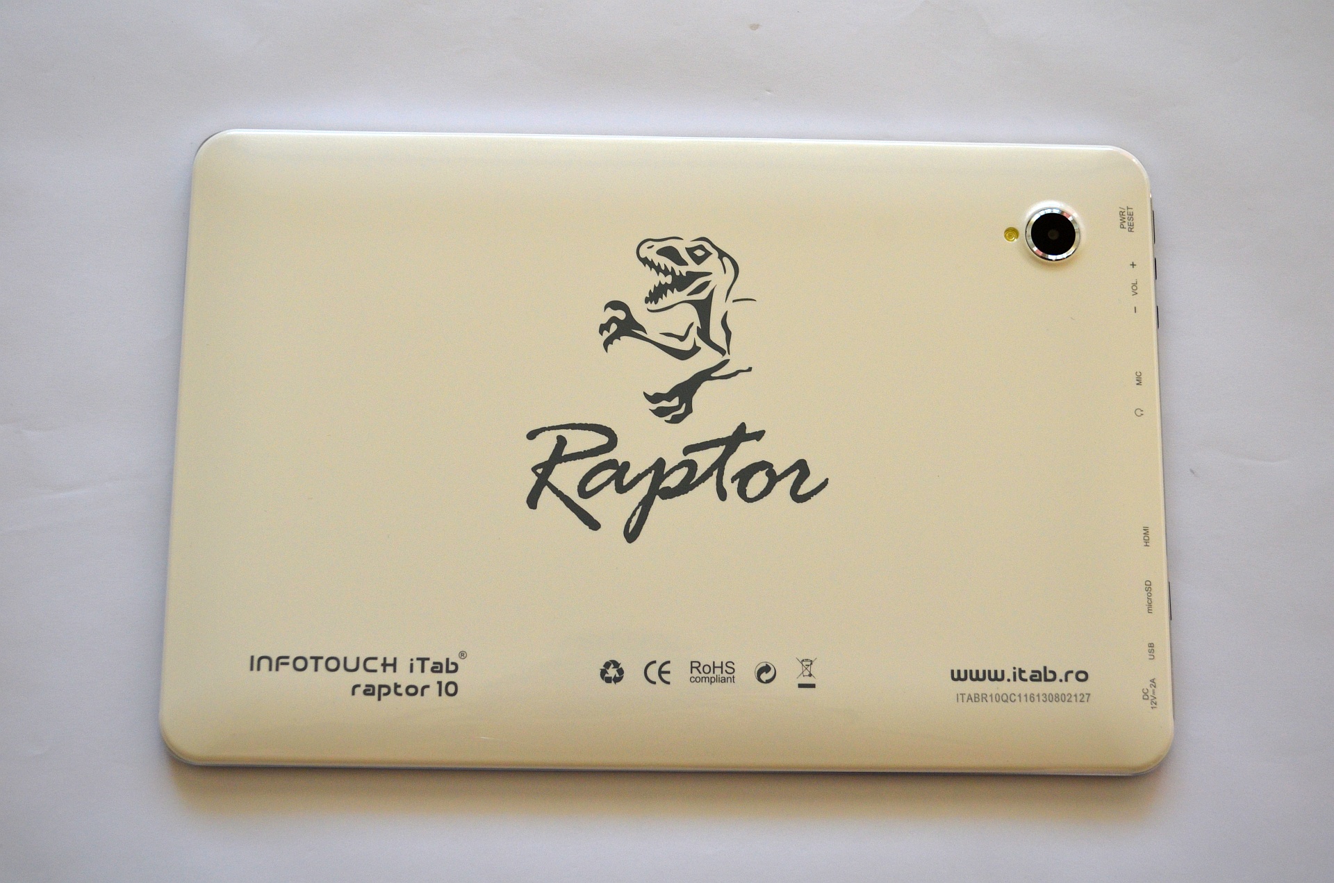 InfoTouch iTab Raptor este un produs adresat nu celor care isi doresc o tableta ieftina, ci acelora care sunt ceva mai exigenti cu bugetul lor pentru acest tip de produs. La prima vedere, design-ul este simplist, cel putin vazut din fata. Are un ecran cu diagonala de 10.1 inci, toate butoanele fiind dispuse pe laterala stanga. Aici gasim, in ordinea descrisa, butonul de Power si butoanele pentru volum, un microfon, conectorul de miniHDMI, un slot microSD, conectorul microUSB, precum si cel de alimentare al tabletei.