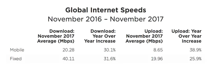 Dacă tragi linie, viteza media a conexiunilor mobile pe mapamond a crescut în 2017 cu 30,1% în materie de download și 38,9% în privința upload-ului. O creștere similară de 31,6% s-a înregistrat pentru viteza de download de care pot profita internauții în confortul căminului, cu fir sau wireless. În privința upload-ului, creșterea a fost de 25,9% la conexiunile de tip broadband – bandă largă.