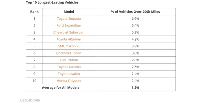 Pe primul loc s-a clasat Toyota Sequola, 6,6% dintre unitățile vândute au peste 200.000 de mile în bord. Toyota este urmată îndeaproape de Ford Expedition, acolo unde 5,4% dintre unitățile tranzicționate au peste 200.000 de mile parcurse. Podiumul este completat de Chevrolet Suburban acolo unde 5,2% dintre mașinile vândute au parcurs peste 320.000 de km.