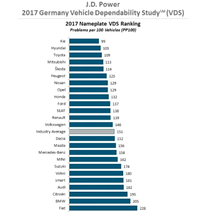 Pe primul loc s-a situat Kia cu un scor de 99, urmată de Hyundai cu un scor de 105 și de Toyota cu un scor de 109. Și Dacia se află pe un binemeritat loc 15, în fața unor mărci consacrate în Occident precum BMW, Audi, Mercedes-Benz, Suzuki sau Fiat.