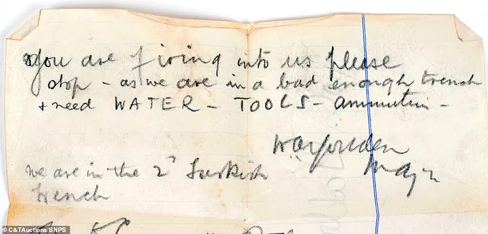 În mesaj, ofițerul cere mai multă apă, unelte și muniție pentru oamenii săi asediați care încercau să le țină piept otomanilor. „Trageți în noi, vă rog să vă opriți – suntem într-un șanț destul de rău și avem nevoie de apă, unelte și muniție”, a scris acesta.
