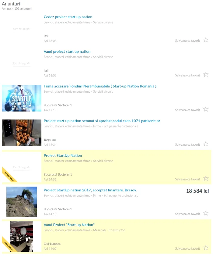 Proiectele Start-Up Nation au început să fie sesizate la începutul anului. În șase luni, pe OLX au ajuns circa 200 de astfel de anunțuri. Peste 80% din proiecte au fost scoase la vânzare în ultimele trei luni, iar active ar mai fi circa 100 de anunţuri. Au fost oferte din București și Cluj, orașe văzute bine pentru dezvoltarea antreprenoriatului, dar n-au lipsit orașe ca Pitești, Craiova, Oradea sau Iași. Pe scurt, România și-a scos la vânzare ideea de afacere.