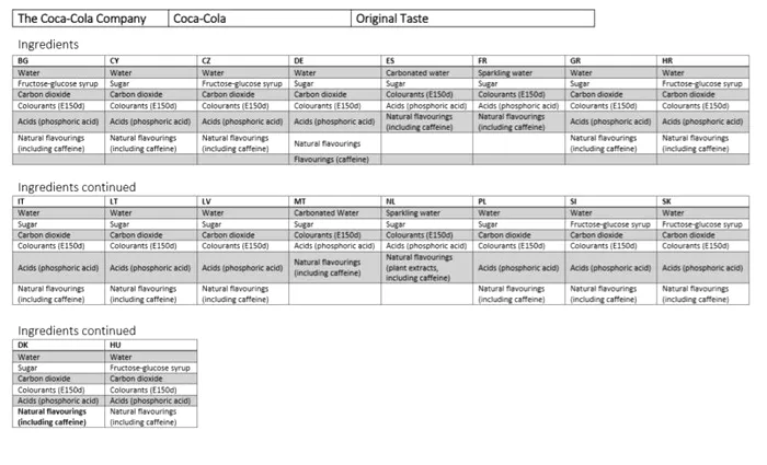 În România, valoarea energetică a 100 ml de Cola este de 180 kj. Putem observa că în 14 țări se folosește apă, iar în altele fie apă carbogazoasă (carbonated), fie apă minerală carbogazoasă (sparkling). În multe țări se folosește zahăr, dar în altele precum Bulgaria, Ungaria, Slovenia, Slovacia, Cehia sau Croația sticla de Coca-Cola conține fructoză.