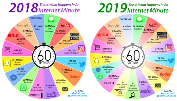 Platformele ca Netflix și Instagram au crescut într-un ritm alert. Dacă pe Netflix, în 2018, în fiecare minut erau consumate 266.000 de ore, în 2019 numărul acesta a ajuns la 694.444. La fel și Instagram, și-a dublat numărul de utilizatori prezenți în fiecare minut de la 174.000 la 347.222.