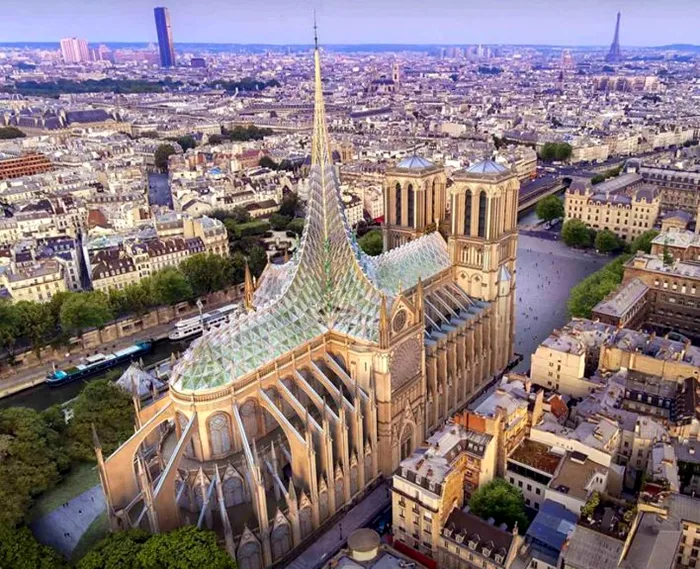 Nu e de mirare că o mulțime de arhitecți și designeri și-au pus mintea la contribuție și au venit cu tot soiul de idei pentru cum ar trebui să arate noua turlă și noul acoperiș al catedralei. Astfel, aceștia și-au reimaginat cum ar putea arăta Notre-Dame peste vreo două decenii – de la turnuri contemporane de sticlă la vitralii gotice.