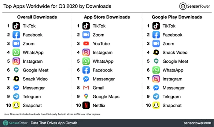 Printre cele mai descărcate aplicații, tot TikTok este premiantă, urmată îndeaproape de Facebook. Cea mai mare surpriză de anul acesta este situarea pe locul trei a aplicației Zoom, ca urmare a lucrului de acasă a tot mai mulți oameni. Zoom le-a luat-o înainte unor aplicații mult mai populare precum Instagram și WhatsApp.