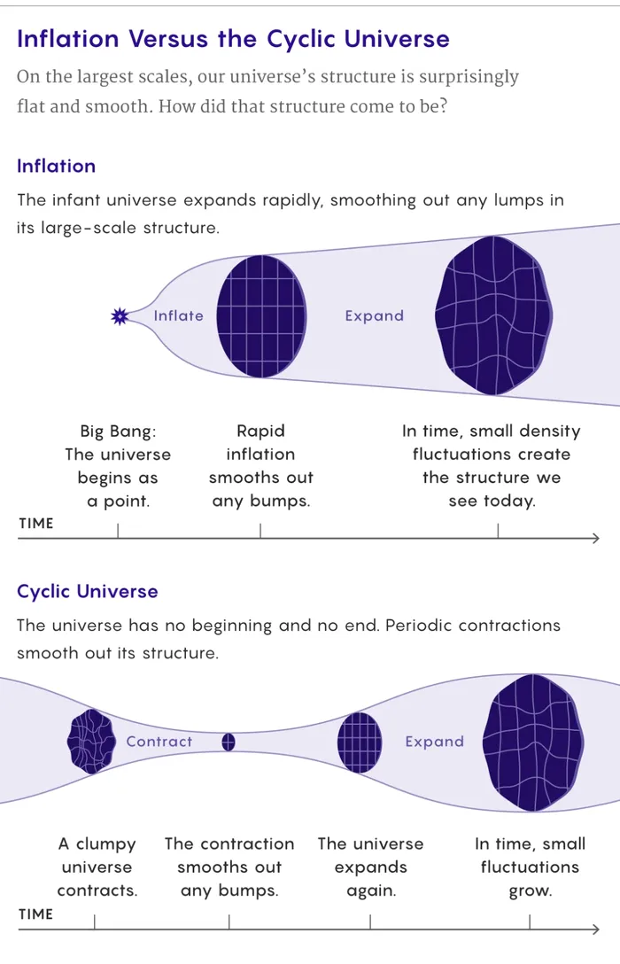 În ultimii ani, Steinhardt și alții au dezvoltat o poveste diferită despre modul în care s-a creat universul nostru. Au reînviat ideea unui univers ciclic: unul care crește și se contractă periodic. Ei speră să reproducă universul pe care îl vedem – plat și neted – fără bagajul care vine cu o explozie.