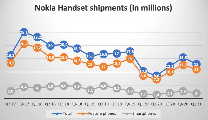 Datele analizate de Counterpoint Research arată că Nokia a vândut în primele trei luni ale anului două milioane de telefoane. E o creștere față de primul trimestru din 2020 – când a livrat doar 1,7 milioane de modele, dar o scădere față de ultimele trei luni din 2020 – când reușise să vândă 2,8 milioane.
