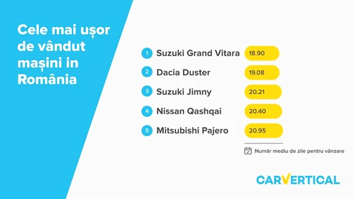 Patru modele din top 5 al celor mai ușor de vândut mașini sunt japoneze, în timp ce a cincea, deloc surprinzător, este Dacia Duster. Modelul este popular, dar nu-l găsești pe toate drumurile, motiv pentru care o astfel de mașină se vinde, în medie, în 19 zile de la publicarea anunțului de vânzare. Un aspect important al acestui studiu este că toate modelele ușor de vândut sunt SUV-uri, iar dacă vrei să vinzi ușor o mașină, nici să nu te gândești să cumperi altceva.