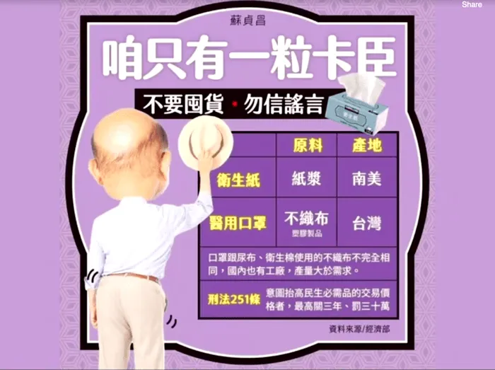 Pe la începutul anului trecut, când toată lumea lua cu asalt magazinele și se făceau stocuri mari de hârtie igienică, circula ideea că Taiwan a rămas fără materiale necesare pentru producția de articole de toaletă, tocmai pentru că a crescut producția de măști de protecție. Imediat, echipa de comedianți a dat drumul pe internet unei meme cu premierul țării. Mesajul era simplu: “we only have one pair of buttocks” – adică ”avem doar o pereche de….fese”.