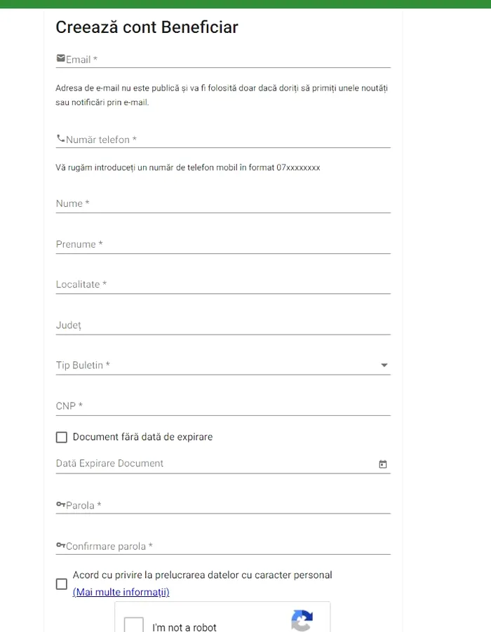 Pentru a-ți crea un cont trebuie să mergi undeva în dreapta – la Înregistrare Beneficiar.