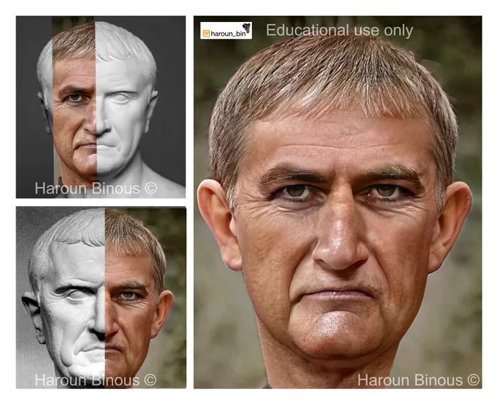 Haroun a căutat cât mai multe busturi ale unui anumit împărat și le-a suprapus în Photoshop, încercând să urmărească trăsăturile faciale. Apoi, el a colorat părul, pielea și ochii în Photoshop și a transferat imaginea pe o platformă AI pentru ca aceasta să-și pună în practică “magia”.