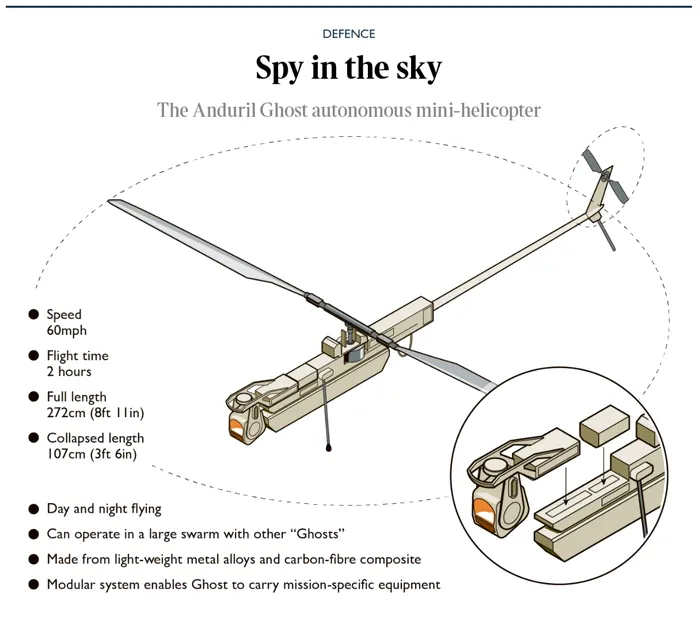 Această dronă-elicopter este realizată de Anduril, un start-up tehnologic din Silicon Valley, care recrutează fostul personal militar din Marea Britanie și își propune să reducă decalajul dintre industria militară și cea tehnologică.