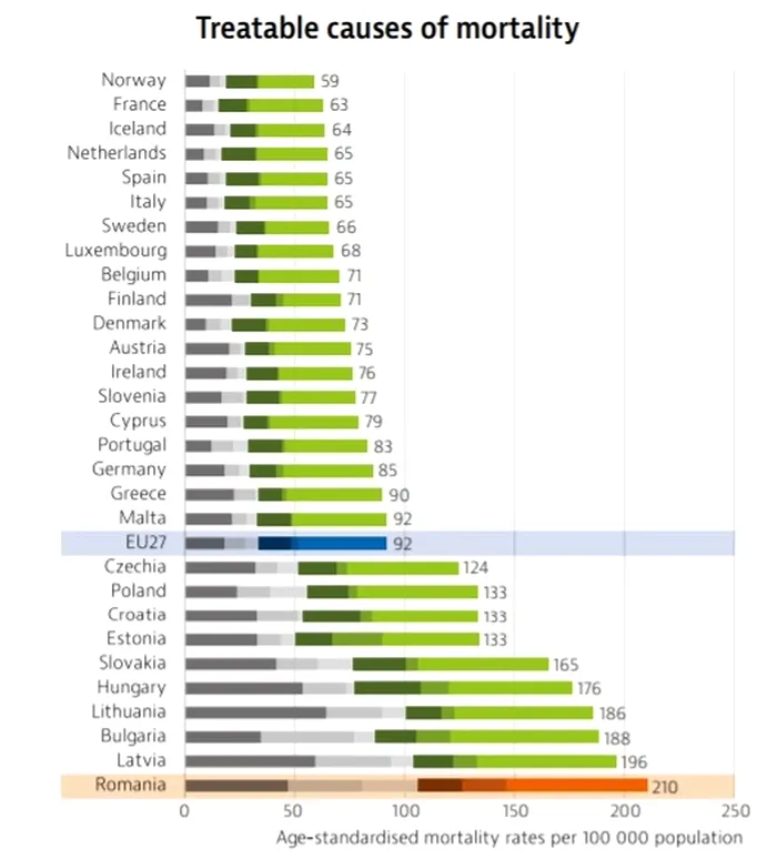 Astfel, la fiecare 100.000 de români, 210 mor din cauze tratabile, ceea ce înseamnă o medie de unul din 476 de români. Media celor 27 de state membre ale Uniunii Europene este de 91 de decese tratabile la suta de mii de locuitori – mai puțin de jumătate față de România.