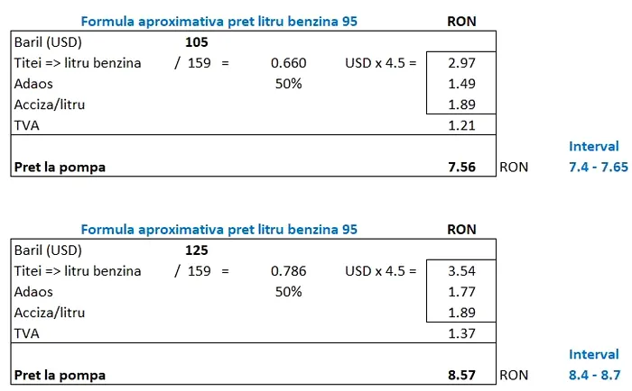 [ (Cotație baril / 159 x 4.5) x 1.5 + 1.89 RON] x 1.19 = Preț la pompă litrul de benzină 95.