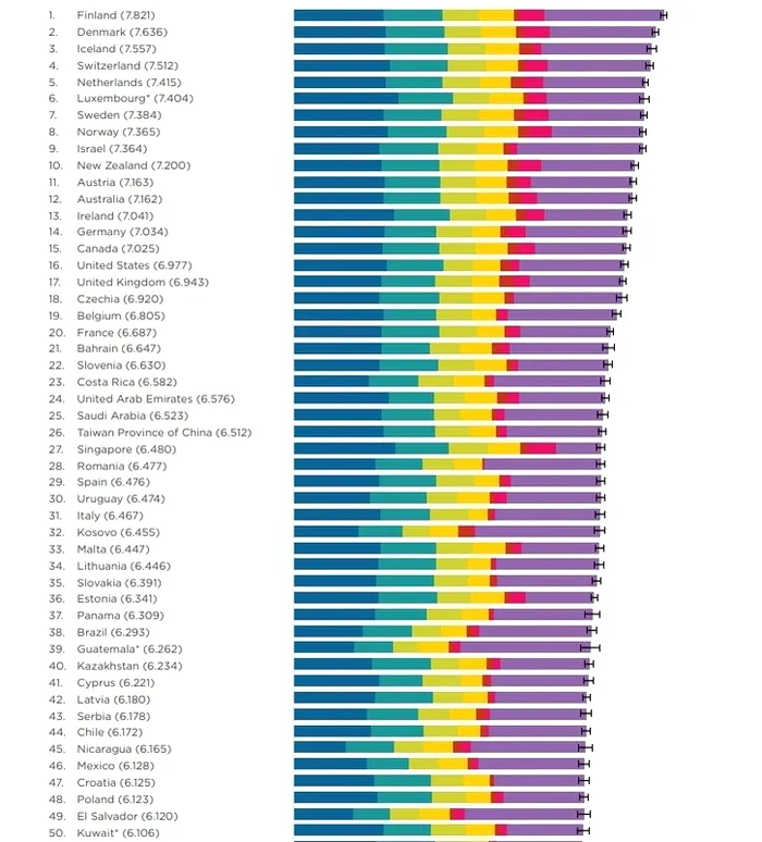 Finlanda a obținut un scor de 7,82 din 10 – țara nordică cu 5,5 milioane de locuitori se află înaintea Danemarcei, Islandei, Elveției și a Țărilor Jos, într-un top 10 neschimbat al clasamentului. Acest top este dominat de țările europene, în special din Europa de Nord. Așadar, Finlanda a fost desemnată cea mai fericită țară din lume pentru al cincilea an consecutiv. Nord-europenii au dominat încă o dată primele locuri – danezii fiind pe locul al doilea, urmați de islandezi, elvețieni și olandezi.