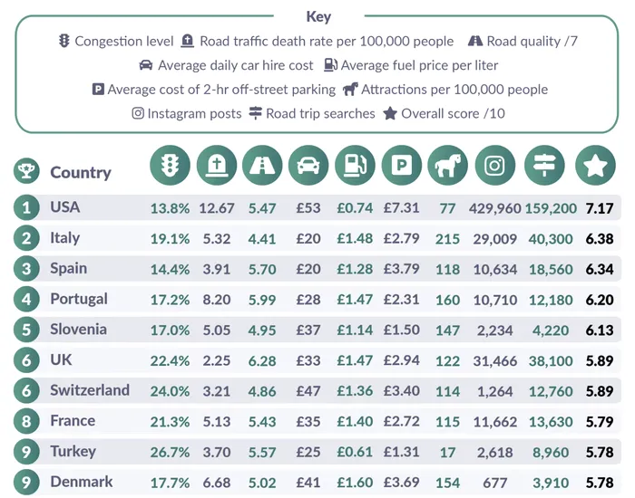 Marea Britanie ocupă locul șase în listă, cu cea mai bună calitate a drumului în rating (6,28 din 10).