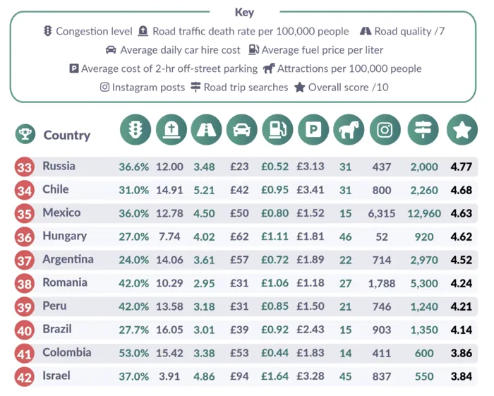 Israelul a devenit cea mai proastă țară pentru șoferii străini în analiza respectivă, cu cel mai mare cost mediu zilnic de închiriere de mașini de 94 de lire sterline și prețuri medii ridicate ale combustibilului de 1,64 lire sterline pe litru, dând țării un scor general de 3,84 din 10.
