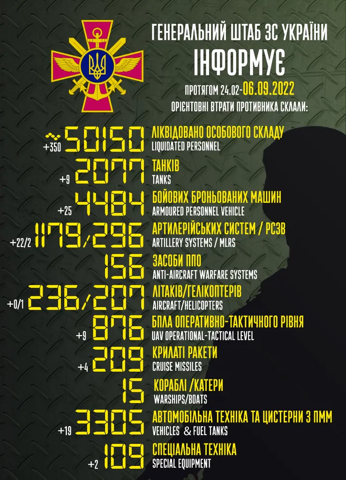 În plus, Rusia a mai pierdut șapte sisteme de apărare aeriană, 24 de MLRS, 60 de rezervoare de combustibil, trei UAV operaționale-tactice și două ambarcațiuni.