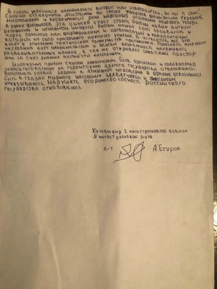 La rândul său, locotenentul A. Yegorov a notat că „încă de la început ne-am confruntat cu înșelăciunea [comandamentului] și ascunderea adevăratelor obiective și sarcini ale desfășurării militare. «Sarcinile de exerciții militare» de neînțeles au însemnat un lucru dramatic diferit… După ce am trecut granița în Ucraina, ne-am discreditat complet atât în ochii lumii, cât și în ochii comunității slave. Din acel moment, acțiunile și natura noastră au fost de armată de ocupație, ceea ce s-a exprimat clar prin reacția populației civile“.