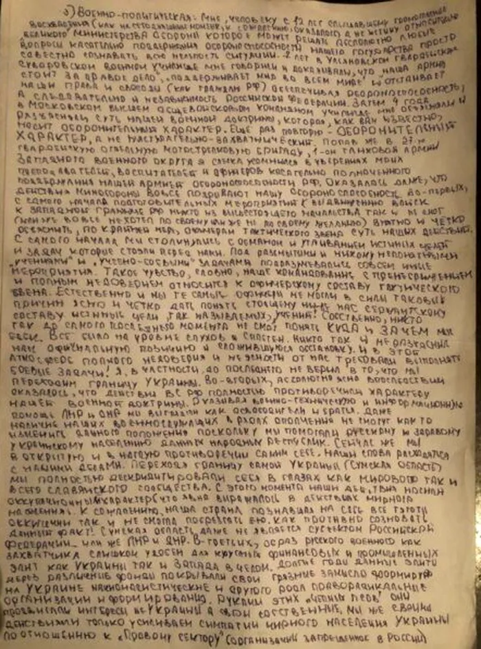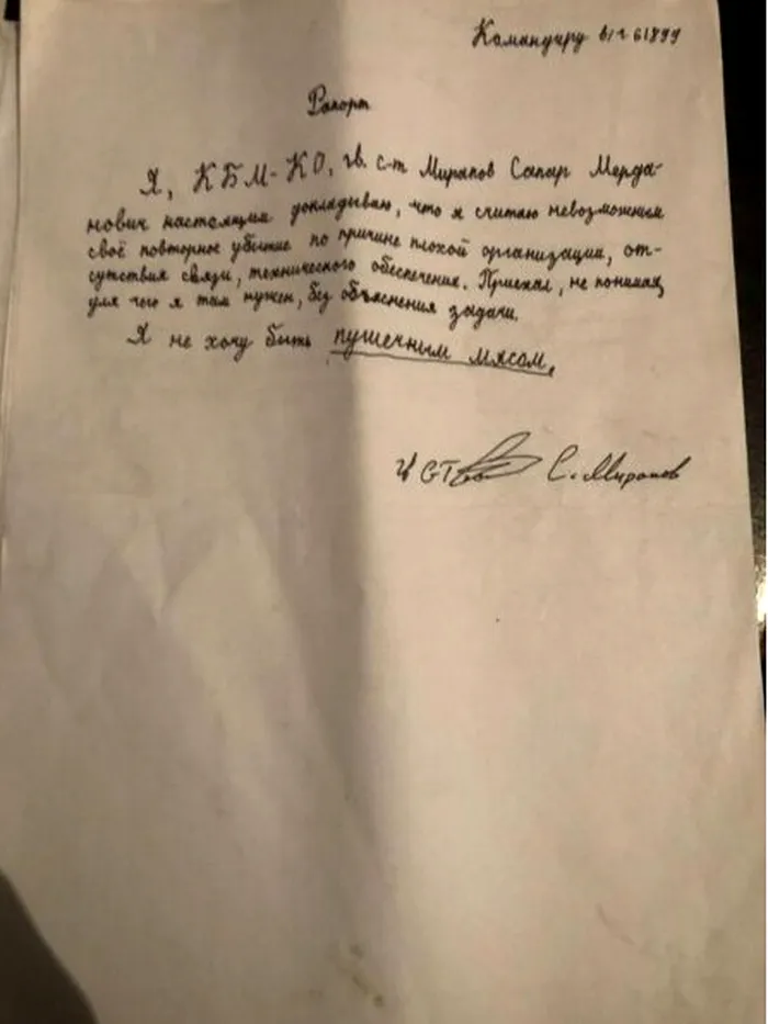 În declarația sa personală către comandantul unității militare de care aparține, sergentul Sapar M. Mirapov a scris următoarele: „Prin prezenta, raportez că consider că este imposibil să fiu trimis înapoi din cauza organizării proaste a unității, lipsei de comunicații și mijloace tehnice. [În turul meu inițial], am ajuns fără să înțeleg de ce era nevoie de mine acolo, fără nicio explicație a sarcinii. Nu vreau să fiu «carne de tun»“.