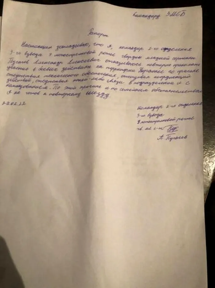 Un alt exemplu îl reprezintă sergentul Alexander A. Pugachev, care l-a informat pe comandantul de batalion că nu-i de acord „să participe din nou la ostilitățile militare din Ucraina din cauza lipsei de sprijin logistic, a lipsei coordonării acțiunilor, a lipsei oricărei comunicări în cadrul unității și cu comandamentul“.