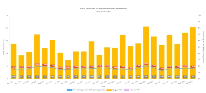 În București un procent de 1,62 de pacienți s-au plâns că au dat bani cadrelor medicale. Totodată, 68, 51% dintre cei care au răspuns au spus că au fost mulțumiți de activitatea medicului, de un procent similar se bucură și asistentele.