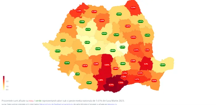 Procentele sunt afișate cu roșu/ verde reprezentând valori sub și peste media națională – de 1.61%, din luna martie 2023.