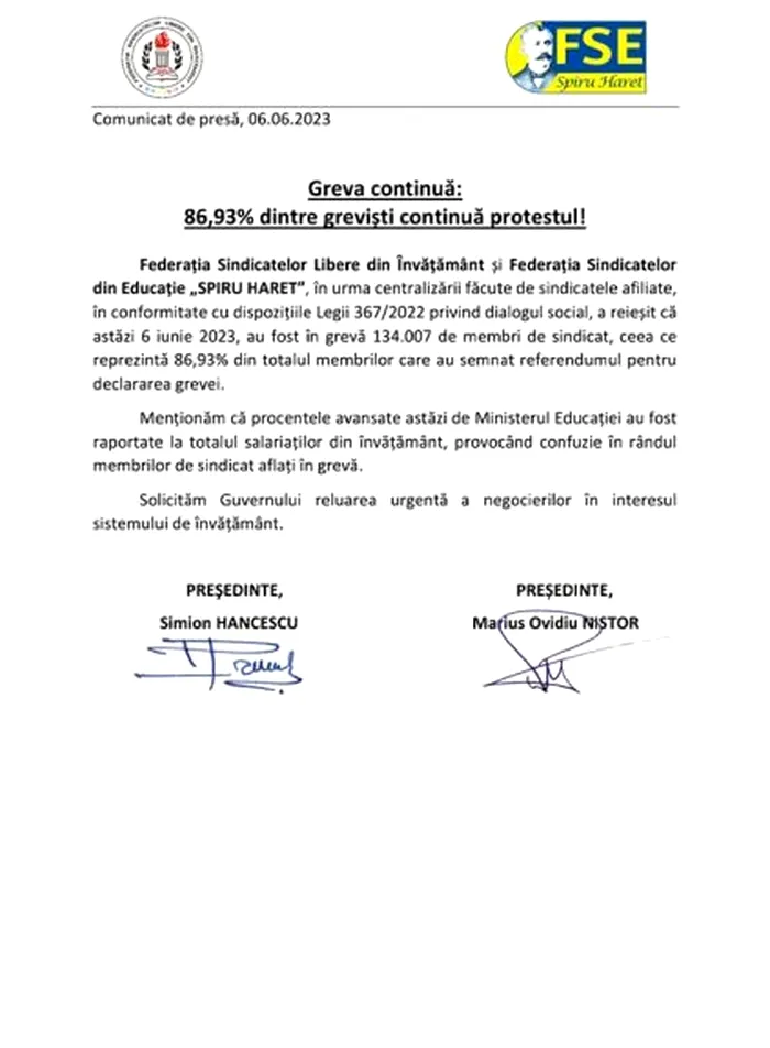 „Federația Sindicatelor Libere din Învățământ și Federația Sindicatelor din Educație „SPIRU HARET”, în urma centralizării făcute de sindicatele afiliate, în conformitate cu dispozițiile Legii 367/2022 privind dialogul social, a reieșit că astăzi 6 iunie 2023, au fost în grevă 134.007 de membri de sindicat, ceea ce reprezintă 86,93% din totalul membrilor care au semnat referendumul pentru declararea grevei!”, au transmis reprezentanții profesorilor într-un comunicat de presă.