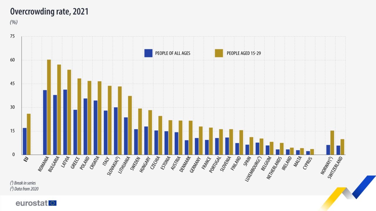 La nivelul Uniunii Europene, în 2021, aproximativ 26% dintre tinerii între 15 și 29 de ani își făceau traiul în gospodării supraaglomerate, peste un sfert. Dacă scoatem vârsta din ecuație, rata de supraaglomerare pentru populația generală a fost în medie de 17%. Cu alte cuvinte, tinerii reprezintă cea mai oropsită categorie, conform analizei Eurostat.