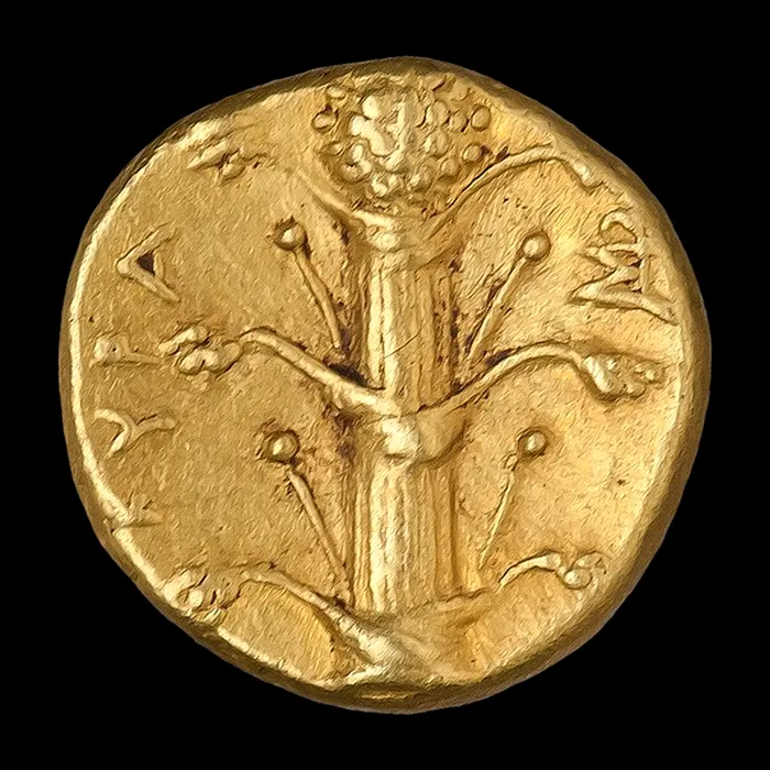 Fotografia unei monede de aur Kyrenaic datată între. A. 308 și c. 277 î.Hr. înfățișând o tulpină de Silphium