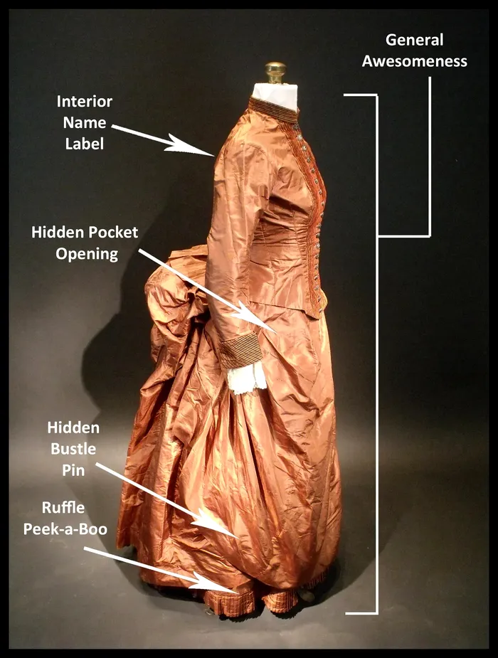 Potrivit postării de pe blog a lui Rivers-Cofield, rochia din două piese de culoarea bronzului datează probabil de la mijlocul anilor 1880. Dar, deși astfel de descoperiri nu sunt neobișnuite pentru cei care caută îmbrăcăminte vintage, ceea ce a găsit în rochie a fost mai mult decat neobișnuit. Rochia avea un buzunar secret cusut, într-un loc greu de atins, care putea fi accesat doar „printr-o fantă discretă din suprafață”, a explicat Rivers-Cofield.