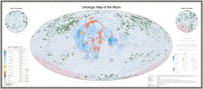 Deși Luna nu are plăci tectonice active care se mișcă una împotriva celeilalte ca pe Pământ, ea conservă ceea ce Liu și colegii săi numesc „unități tectonice” de la începuturile formării sale. Harta tectonică dezvăluie locațiile lor, împreună cu o explicație a sistemului de clasificare a structurilor lunare. Harta litologică marchează diferitele tipuri de roci prin culoare, în timp ce harta geologică este cea mai familiară, identificând craterele, compoziția lor și momentul formării acestira.