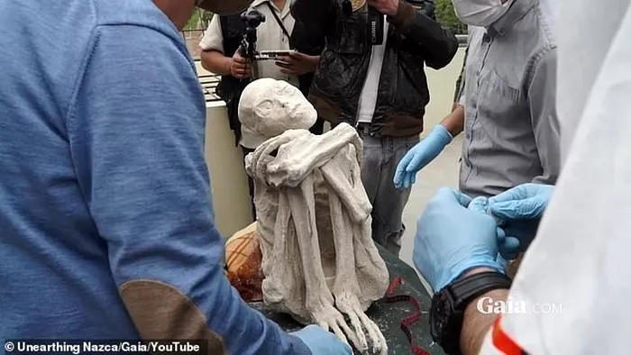 Cercetătorii au observat că oasele creaturii se aliniază perfect sub învelișul mumificat, asemănător modului în care sunt structurate oasele umane. Craniul alungit al mumiei nu prezintă semne de deformare craniană artificială, iar analizele au datat mumia între anii 240 și 383 d.Hr., indicând coexistența sa cu civilizația Nazca.