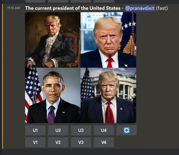 Aceste teste au fost efectuate de publicația Engadget, care a constatat că, la cererea de a crea o imagine cu „președintele Statelor Unite”, Midjourney a generat patru imagini în diferite stiluri ale fostului președinte Donald Trump.