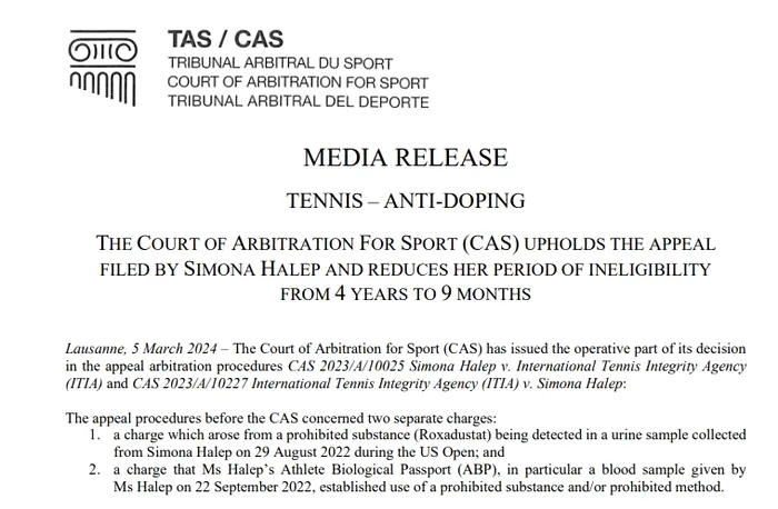 Simona Halep a făcut apel împotriva suspendării de patru ani impuse în septembrie 2023 de un tribunal al Agenției Internaționale pentru Integritate în Tenis. Deși a concluzionat că românca nu știa că suplimentul ar fi putut conține Roxadustat, tribunalul a precizat că nu a fost vorba doar despre contaminare, deoarece nu se poate explica de ce a fost găsit atât de mult medicament în proba ei de urină din 29 august 2022.