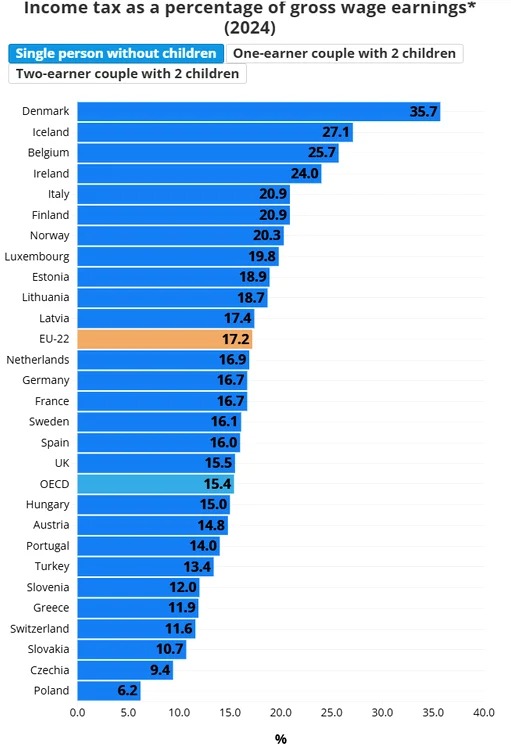 Pentru o persoană singură fără copii, impozitul pe venit ca procent din câștigurile salariale brute variază de la doar 6,2% în Polonia – cel mai mic din Europa – până la un impresionant 35,7% în Danemarca, țară recunoscută pentru modelul său social generos, dar costisitor. România, cu cei 10% impuse uniform din 2018, se află în zona de jos a clasamentului, depășită însă de vecini precum Slovenia, Grecia, Elveția, Slovacia și Cehia, care au cote de 12% sau mai mici.