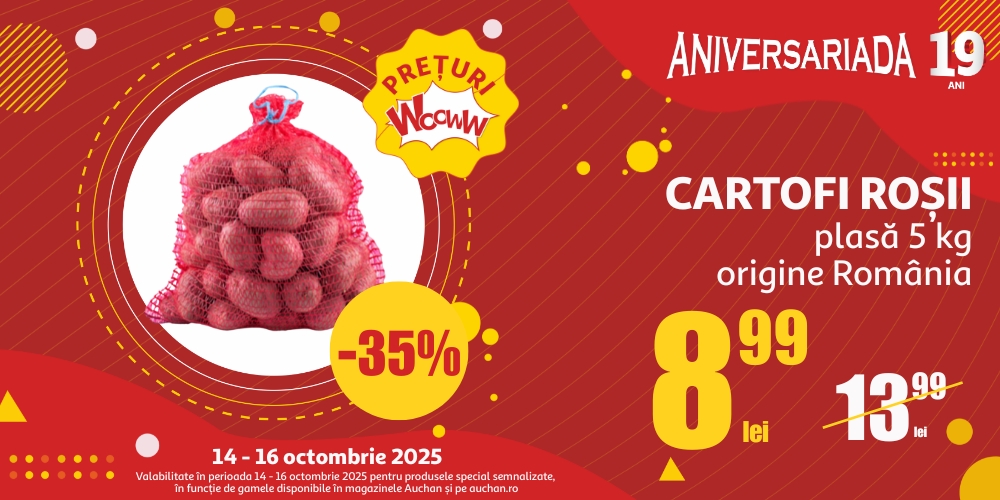 - Cartofi roșii, plasă 5 kg, origine România, la doar 8,99 lei (reducere -35%)