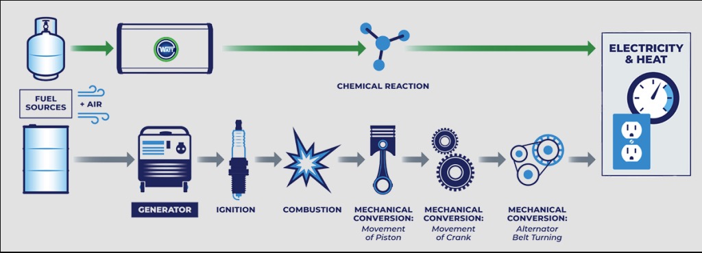 WATT HOME folosește o celulă de combustibil cu oxid solid (solid oxide fuel cell), alimentată cu gaz natural. Pe scurt, sistemul transformă gazul și oxigenul din aer în energie electrică, iar ideea este să obții un backup mai curat și mai silențios decât un generator termic convențional, păstrând în același timp avantajul unui „combustibil” deja disponibil la multe locuințe: rețeaua de gaz.