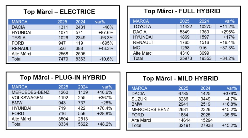 În schimb, hibridele devin tot mai “mainstream”. Corolla conduce topul la hibride fără încărcare externă, iar la mild hybrid se vede un câștigător clar: Duster, cu un volum mult peste următorii clasați. Tradus pe limba pieței, românii au început să caute tot mai mult soluții de consum mai mic și confort urban, dar care păstrează logica clasică de alimentare și utilizare. Dacă vrei o tranziție fără stres, hibridele (în special cele fără încărcare externă) sunt, pentru mulți, punctul de mijloc care a prins cel mai bine în 2025.
