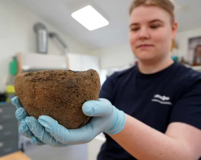 Un conservator al Muzeului Moesgaard ține un bol ceramic descoperit la locul de înhumare. Fotograf: James Brooks/AFP/Getty Images