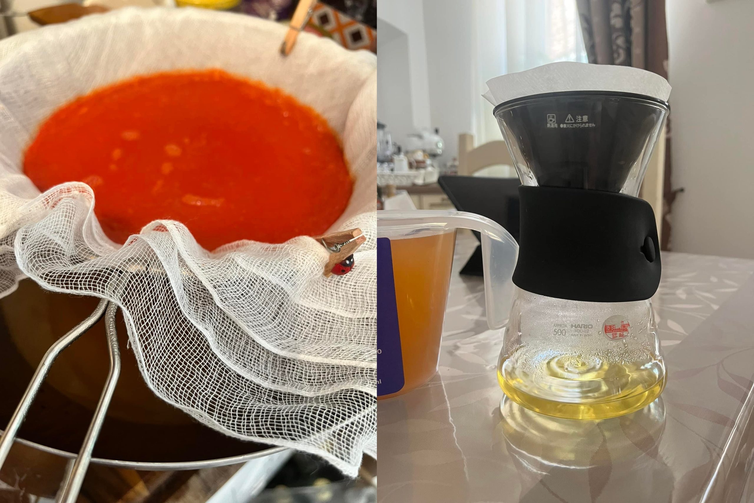 În acest scop, trebuie să obții o așa numită apă de roșii. Pentru asta, poți blenda 500 de grame de roșii, cu o tulpină de apio, eventual un ardei iute, jumătate de linguriță de sare preferabil afumată (sau mai puțină după gust), câteva frunze de busuioc, leuștean și 30ml suc de lime. Tot în acest mix blendat poți pune și sos Worchstershire și piper. Scopul este ca rezultatul să fie baza cocktailului pe care mai apoi să o filtrezi. Eu am optat pentru o filtrare inițială prin tifon, după cum se poate vedea în imaginea de mai sus și o a doua filtrare prin filtru de cafea. În mod previzibil, întregul proces necesită foarte multă răbdare, aproximativ 4 ore pentru fiecare pas, deși îți recomand să aștepți chiar și peste noapte, cu condiția foarte importantă de a realiza filtrarea la rece. Pune vasele în frigider. La final, pentru cocktailul efectiv, amestecă ingredientele într-un pahar de mixat cu multă gheață mare. Mai jos ai și o rețetă completă de Bloody Maria folosind lichidul clarifiat pentru simplul fapt că versiunea cu Tequila sau Mezcal mi se pare mult mai potrivită pentru acest mix de arome decât cea cu vodcă.