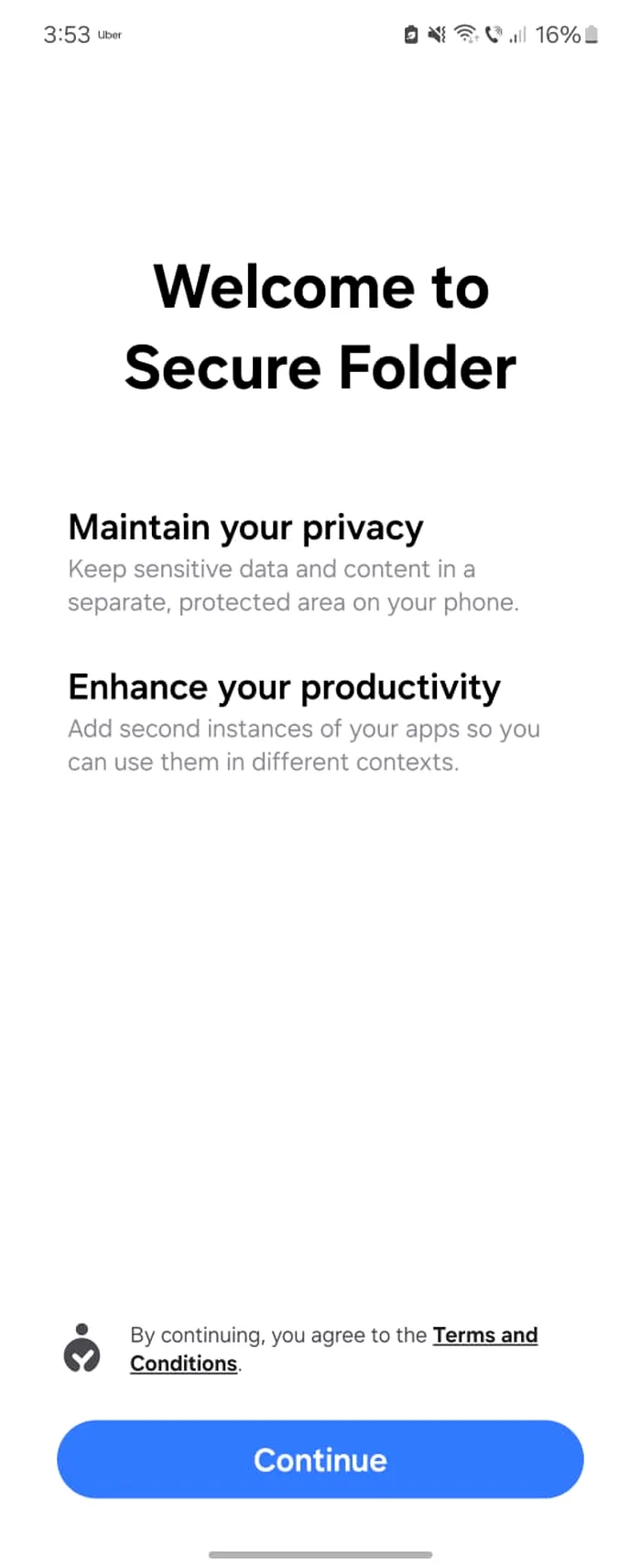 - Selectează Folder securizat și urmează pașii de configurare. Va trebui să îți creezi un cont Samsung, dacă nu ai deja unul.