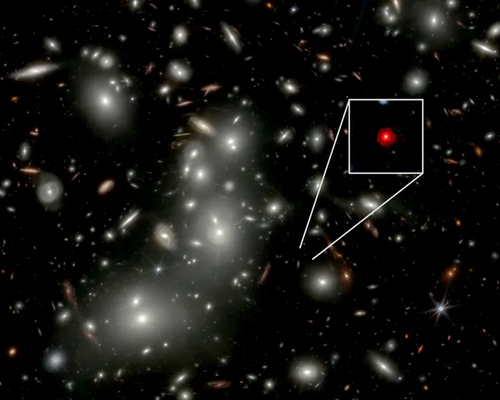 Observațiile se concentrează pe un ‘punct roșu mic’ cunoscut sub numele de QSO1, care datează de mai bine de 13 miliarde de ani. Foto: JWST/Nasa/Esa/CSA; procesarea imaginii NIRCam: Lukas Furtak/Rachel Bezanson