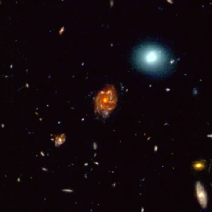 Galaxia Big Wheel este văzută în centru. În contrast izbitor, galaxia albastră strălucitoare (dreapta sus) se află la doar aproximativ 1,5 miliarde de ani lumină distanță, ceea ce face ca Big Wheel să fie de aproximativ 50 de ori mai departe. Deși ambele par de dimensiuni similare, distanța enormă a Big Wheel dezvăluie scara sa fizică cu adevărat colosală. (JWST)
