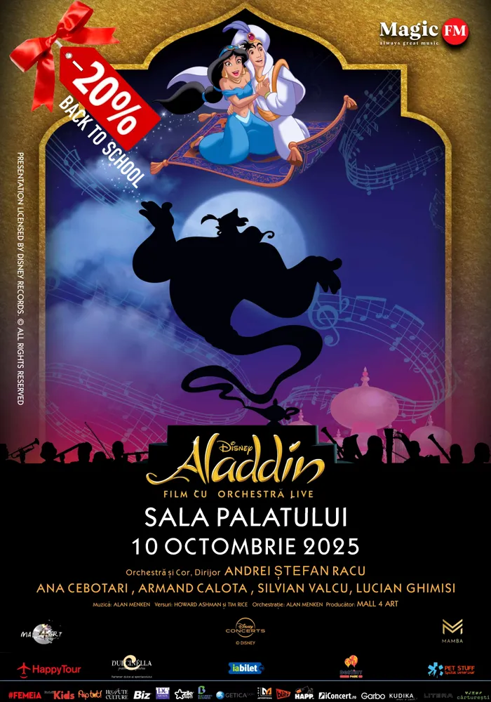 Biletele pentru spectacolul „Disney – Aladdin in Concert Live to Film” sunt disponibile pe iabilet.ro, iar în această perioadă pot fi achiziționate la prețuri reduse, în cadrul campaniei „Back to School”. Organizatorii încurajează publicul să își rezerve locurile din timp, având în vedere interesul ridicat pentru acest eveniment unic.